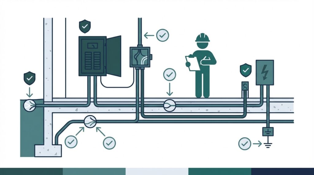 Valvomme sähköteknisten asennusten toteutusta, laatua ja suunnitelmanmukaisuutta säännöllisillä työmaakäynneillä. Aktiivinen läsnäolo työmaalla varmistaa, että asennustyö etenee suunnitelmien mukaisesti ja mahdollisiin poikkeamiin puututaan välittömästi – ennen kuin pienet ongelmat kasvavat suuriksi.