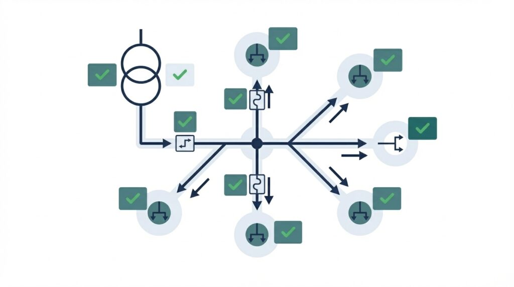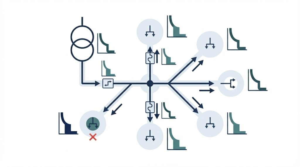 Varmistamme, että jännitteenalenema pysyy sallituissa rajoissa kaikissa verkon osissa. Liiallinen jännitteenalenema heikentää laitteiden toimintaa, lyhentää niiden elinkaarta ja voi aiheuttaa toiminnallisia häiriöitä – erityisesti pitkillä kaapelireiteillä ja suuritehoisilla kuormilla.