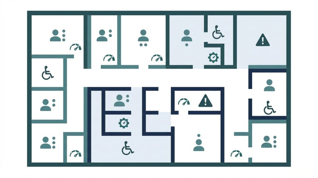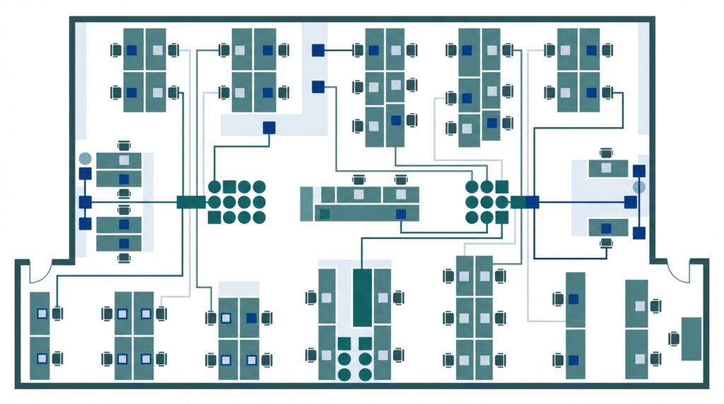 Määrittelemme liitäntäpisteiden määrät ja sijainnit käyttötarpeiden mukaan. Oikea sijoittelu palvelee käyttäjiä tehokkaasti, vähentää tarvetta tilapäisratkaisuille ja mahdollistaa tilamuutokset ilman merkittäviä kaapelointimuutoksia.